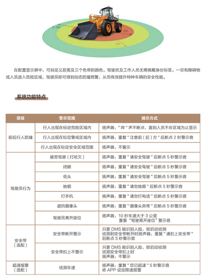 特種車輛智能識(shí)別防撞預(yù)警系統(tǒng)是專為工程車輛叉車、裝載機(jī)、挖掘機(jī)、推土機(jī)、礦山港口移動(dòng)車輛設(shè)備所設(shè)計(jì)的智能識(shí)別防撞預(yù)警安全裝置,能夠?qū)崟r(shí)偵測工作區(qū)域的危險(xiǎn)狀態(tài)并提供警示,有助于提升預(yù)防工程特種車輛作業(yè)安全。一旦有障礙物或人員進(jìn)入危險(xiǎn)區(qū)域,駕駛員可得到動(dòng)態(tài)防撞預(yù)警并發(fā)出報(bào)警進(jìn)行實(shí)時(shí)減速或停車,該系統(tǒng)能在各種復(fù)雜廠區(qū)路況及工礦環(huán)境中幫助駕駛員避免危險(xiǎn),預(yù)防事故發(fā)生減輕壓力,提供豐富的駕駛員輔助環(huán)境感知等功能